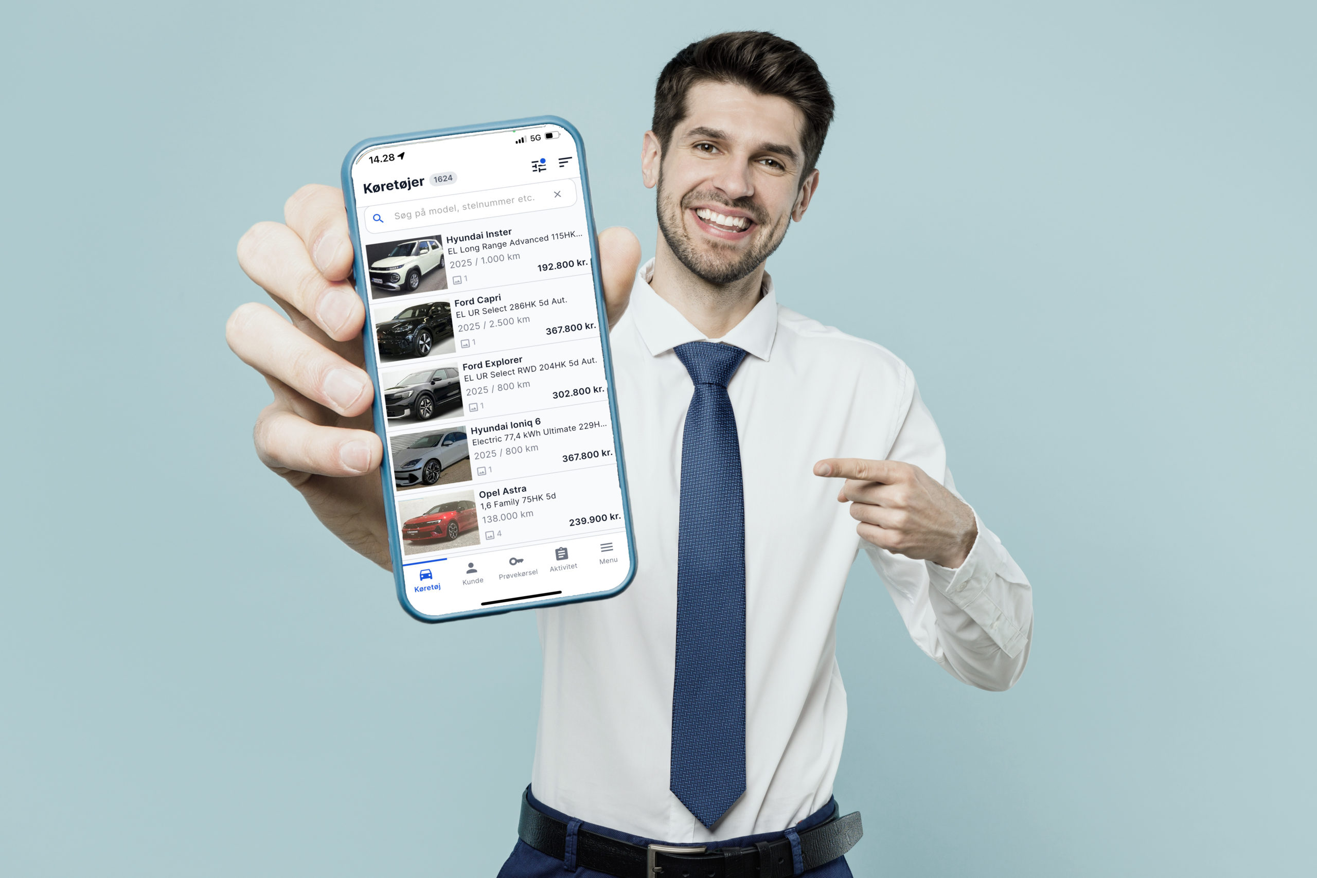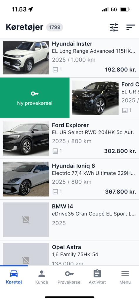 Appen har fået smarte swipe-funktioner, du kan benytte som genveje på køretøjs- og kundelisterne. Det betyder, at du med et enkelt swipe på en kunde straks kan starte en prøvekørsel, mens du med et swipe på et køretøj hurtigt kan tilføje udstyr eller billeder til den ønskede bil. Swiper du til den anden side, kan du også her starte en prøvekørsel.