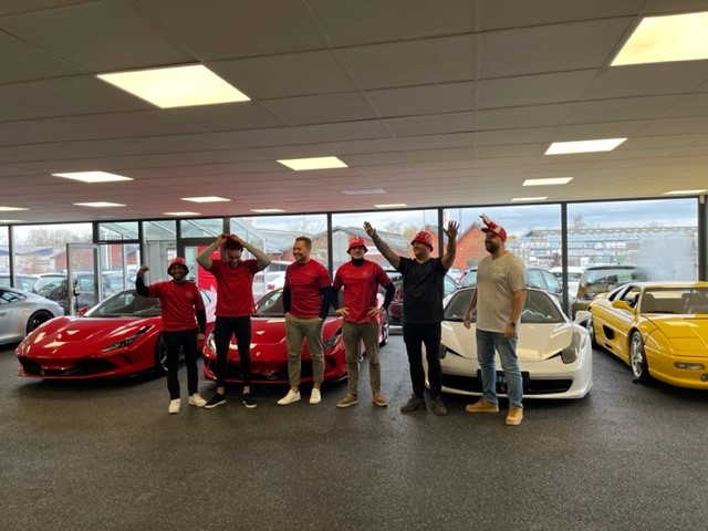 Youtuberen Lakserytteren har sammen med børnefamilier malet den Ferrari, Hüseyin her står bagved i udstillingslokalet (klik på billedet, for at se det større).